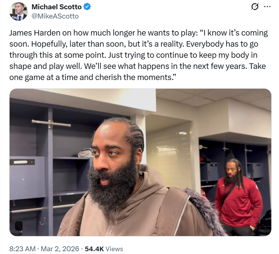 尽管状态不俗,但已经年满36岁的哈登赛后还是难免被问到退役问题,哈登公开表示:“我知道离退役的日子越来越近了,希望这一天能晚一些,自己会努力保持身体状态,一场一场地打,珍惜当下的每一刻。”
